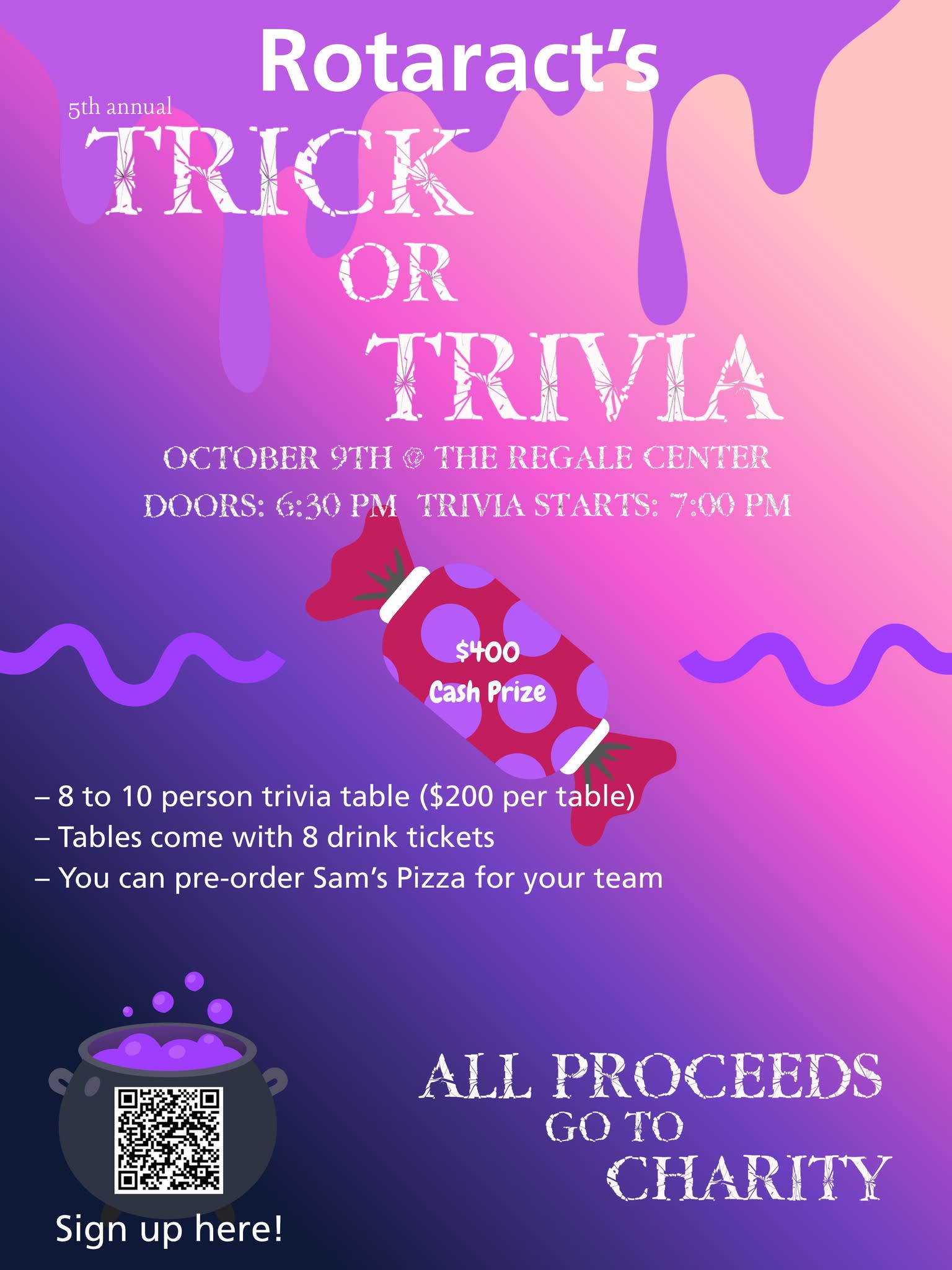 Rotaract’s 5th Annual Trick-or-Trivia Event is set for Thursday, October 9, 2025. A fun night of quality trivia with your friends and our community! Now is the time to reserve your teams spot!